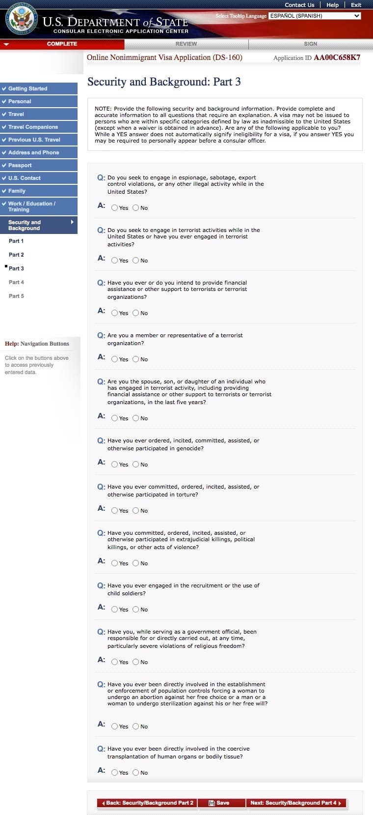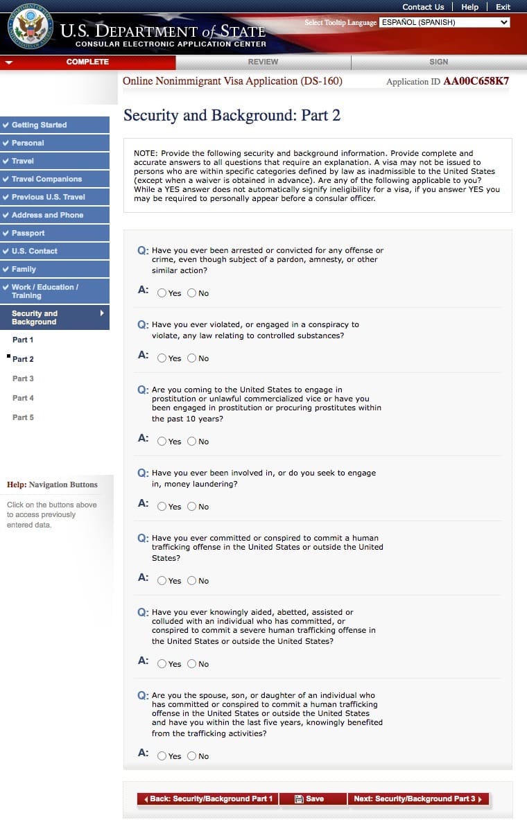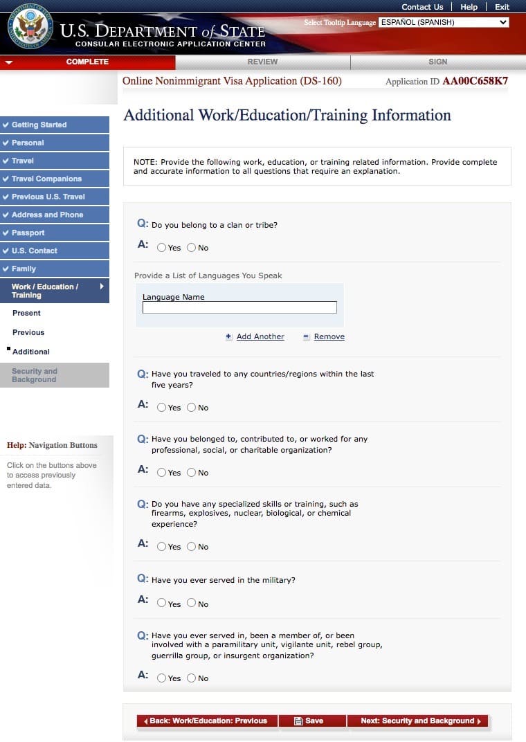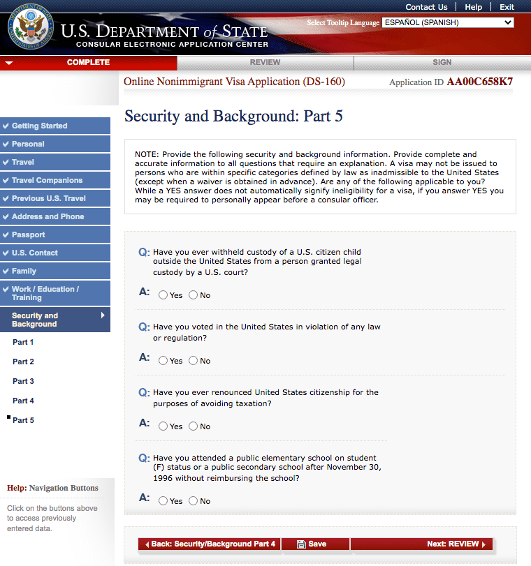 Preguntas del Formulario DS 160