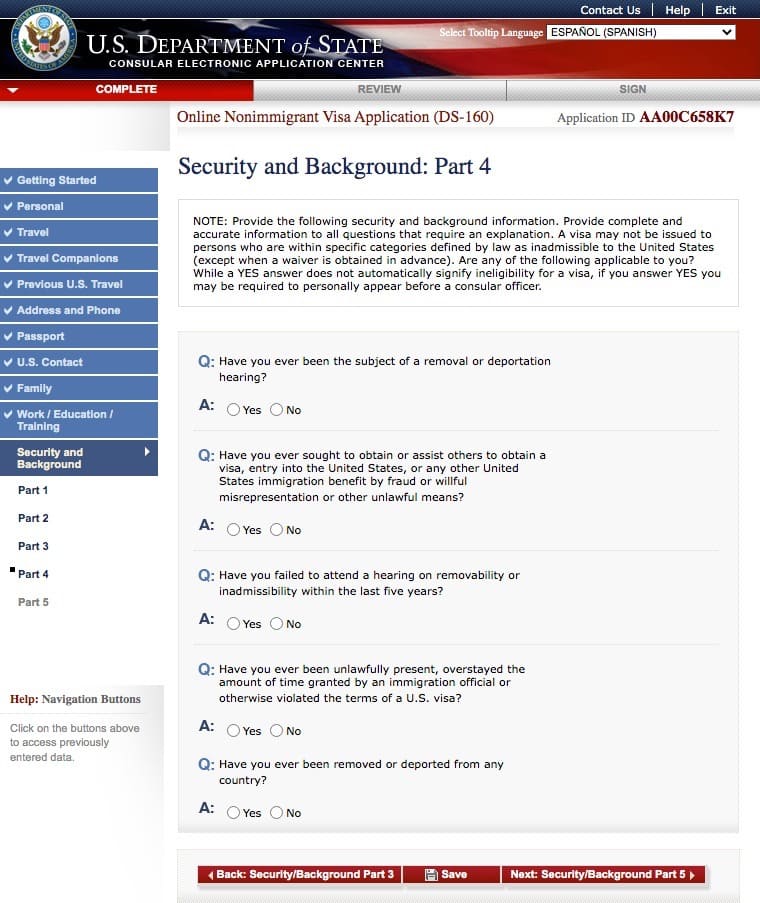 Proporcionar informaci贸n completa y precisa a todas las preguntas que requieran una explicaci贸n. No se puede emitir una visa a personas que se encuentran dentro de categor铆as espec铆ficas definidas por ley como inadmisibles en los Estados Unidos (excepto cuando se obtiene una exenci贸n por adelantado