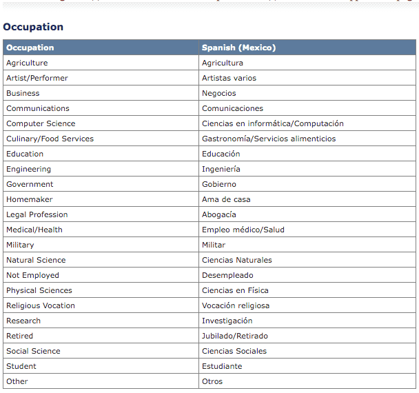 Opciones en espa帽ol de su ocupaci贸n actual: