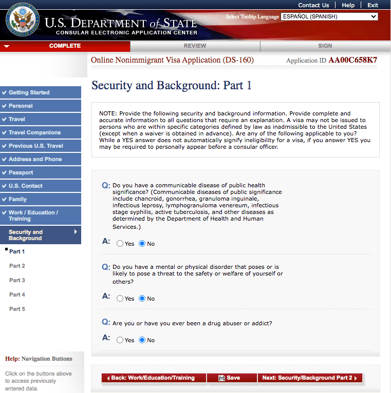 - 1.1 Preguntas del Formulario DS 160